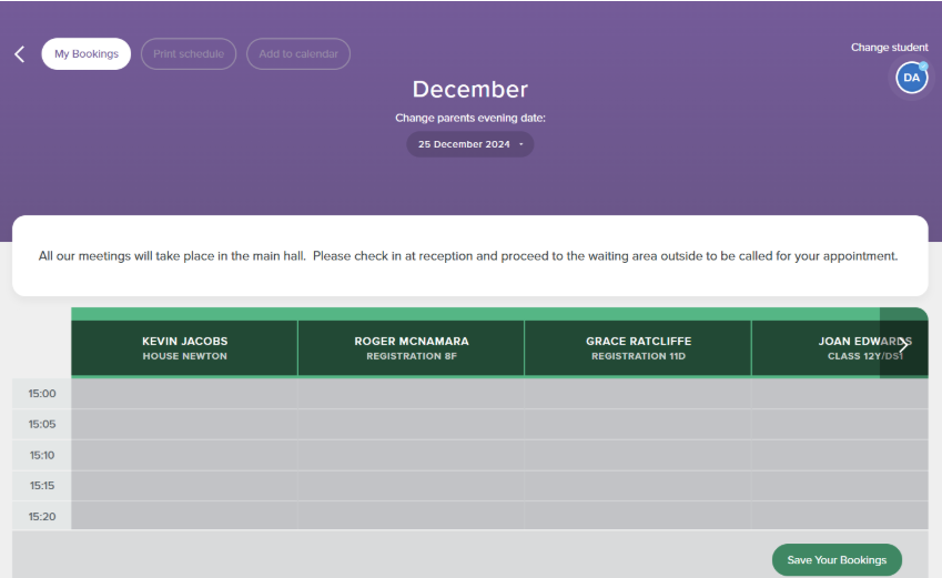 The child you are booking for will show in the top right-hand corner of the screen. If you have more than one child at our school, you will see a circle for each child. Simply click on the relevant circle to select the child you want to make a booking for.