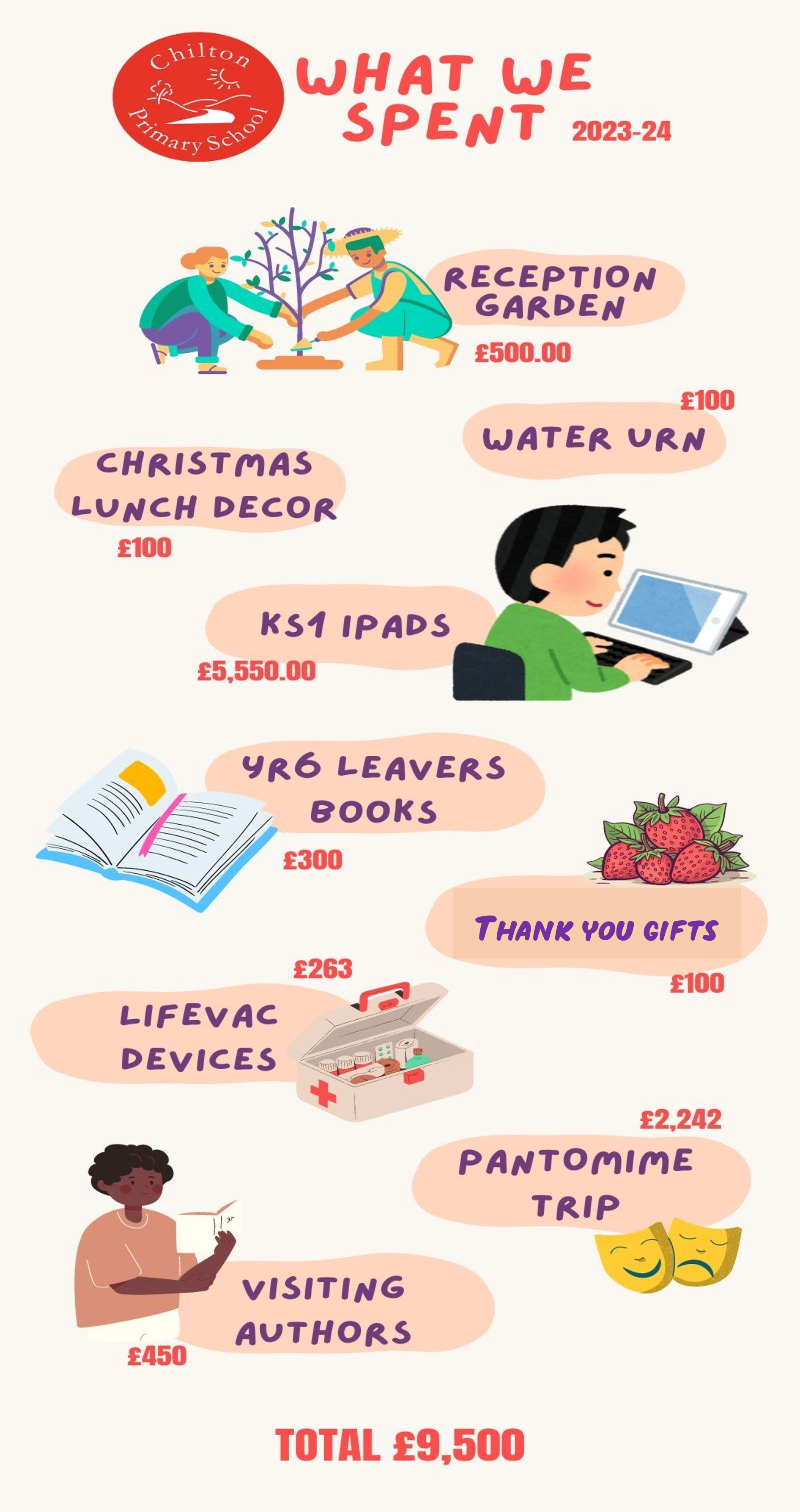 Currently the PTA is only a small group of parents who give up their time to organise fundraising events for the School. A breakdown of what we donated to the school last year is attached. Many hands make light work, so if you are able to help with a few things like wrapping lucky dip prizes / requesting raffle prizes / running a stall etc.. that would be incredibly helpful, please do get in touch. Everything we do directly benefits all children of Chilton School.
